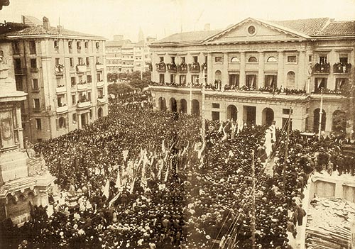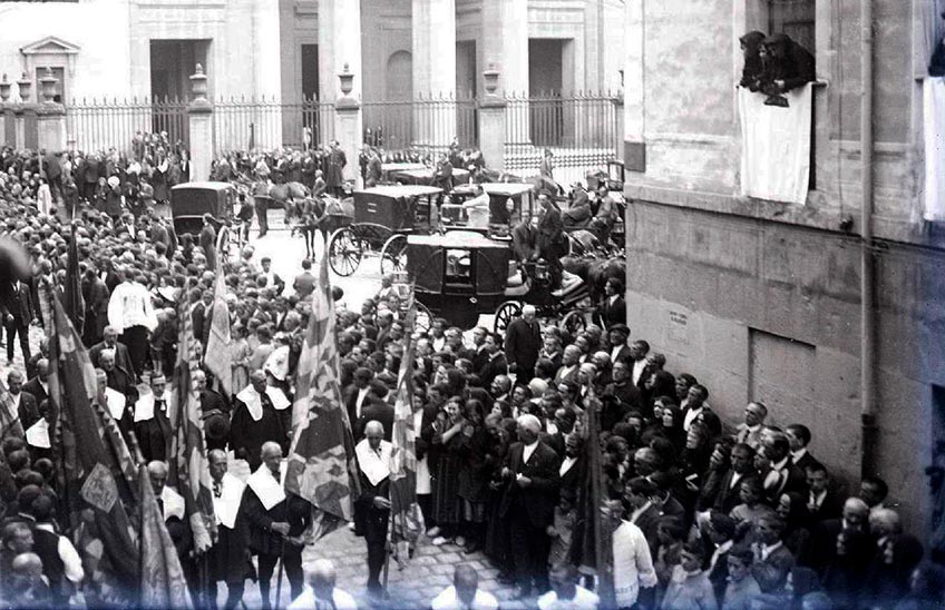 Acto de bendición con la reliquia de san Francisco Javier y el Cristo del cangrejo desde el palacio de Diputación, tras la procesión, en Pamplona el 24 de septiembre de 1922. Fotografía de Alfonso Ciarán (Madrid)