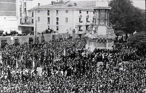 Asistentes al acto de bendición con la reliquia de san Francisco Javier y el Cristo del cangrejo, 24 de septiembre de 1922. Bajo el monumento a los Fueros se pueden ver las imágenes de San Fermín, la Virgen del Sagrario y San Miguel de Aralar, que habían participado en la procesión. Foteteca Archivo Municipal de Pamplona