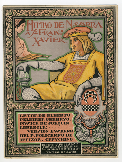 La portada en color de esta composición es, sin duda, una de las más ricas de las obras musicales relacionadas con Navarra y Javier. El protagonismo corresponde a uno de los maceros de la Diputación, sedente con la maza ceremonial del Reino y el escudo de Javier con un rosario. En el margen superior izquierdo una matrona con la partitura se dispone a interpretar y en la parte inferior se coloca el título, los autores con sus nombres y el del padre capuchino Policarpo de Iraizoz, autor de la versión de la letra en euskera.