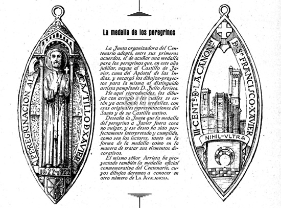 La medalla del peregrino tiene forma almendrada y de ella dio cuenta la revista La Avalancha (8 y 24 de marzo de 1922), con el dibujo a plumilla por el anverso y reverso y el siguiente texto: “La medalla de los peregrinos: La Junta organizadora del Centenario adoptó entre sus primeros acuerdos, el de acuñar una medalla para los peregrinos que, en este año jubilar, vayan al Castillo de Javier, cuña del Apóstol de las Indias, y encargó los dibujos proyectos para la misma al distinguido artista pamplonés don Julio Arrieta. He aquí reproducidos, los dibujos con arreglo a los cuales se están ya acuñando las medallas, con esas originales representaciones del Santo y de su Castillo nativo. Deseaba la Junta que la medalla del peregrino a Javier fuera cosa no vulgar, y ese deseo ha sido perfectamente interpretado y cumplido, como ven los lectores, tanto en la forma de la medalla como en la manera de tratar sus elementos decorativos. El mismo señor Arrieta ha proyectado también la medalla oficial conmemorativa del Centenario, cuyos dibujos daremos a conocer en otro número de LA AVALANCHA”. La acuñación se hizo conforme a los diseños y sus inscripciones, haciendo constar las fechas conmemorativas y la razón de la acuñación -peregrinación al castillo-.