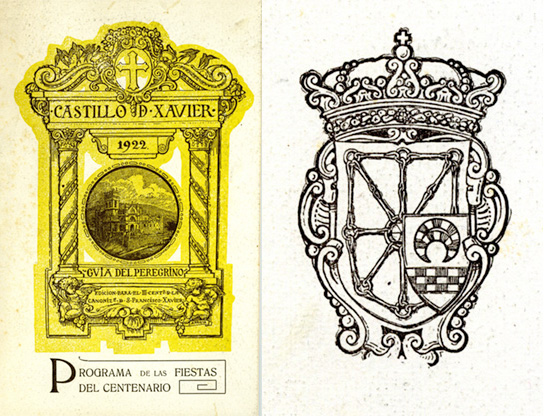 El programa de actos bellamente ilustrado por Artes Gráficas de Pamplona en aquel año de 1922, cuenta con una portada de Arrieta a dos colores, el dibujo propiamente dicho en sepias sobre un fondo amarillo. En él encontramos un gran retablo con el banco con sendos ángeles y una inscripción en la que leemos “EDICION PARA EL III CENTENARIO DE LA CANONIZACIÓN DE S. FRANCISCO XAVIER”, un único cuerpo en cuyo interior luce un medallón circular con un dibujo del castillo y la fecha 1922, sobre él, y un ático con una cruz entre molduras curvas, frutos y la inscripción CASTILLO DE XAVIER. La contraportada luce un escudo timbrado por la corona real con las armas de Navarra y en o que sería el cuarto cuartel las de Javier.