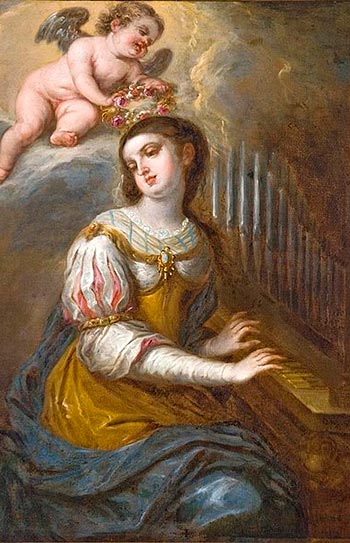 La joven Cecilia, martirizada hacia el año 230, había llegado al patronato sobre la música, en gran parte, por una defectuosa versión de lo que contenían las Actas que recogían su martirio y datan del siglo V, siendo por tanto posteriores en más de tres siglos a su muerte. El relato posee escaso valor histórico y es más bien un romance pío, como tantos otros recopilados en los siglos V y VI.