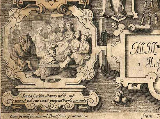 Bodas de santa Cecilia en una viñeta de la wundervita realizada por Cornelio Galle por dibujo de Francesco Vanni en 1601. Foto Biblioteca Digital Hispánica. Biblioteca Nacional