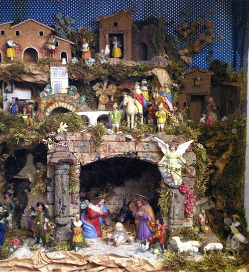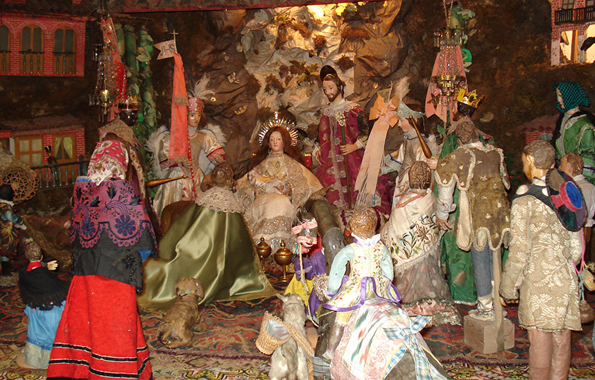 Algunas familias nobles, deseosas de emular las modas impuestas por Carlos III en la Corte madrileña, hicieron lo propio en sus mansiones. Al respecto, hay que recordar el texto de José Blanco White, recogido en sus “Cartas de España” (1808), cuyo contenido es aplicable a muchas ciudades hispanas. Así reza su contenido: “Hace treinta o cuarenta años, las familias acomodadas tenían la costumbre de preparar, para una exhibición pública, dos o tres habitaciones de la casa, en las que sobre una rústica imitación de rocas y montañas, colocaban entre lámparas y velitas una gran cantidad de figuras de barro que representaban las acciones más corrientes de la vida. En el centro de la escena se podía ver un establo medio en ruinas con las figuras de José, María y varios pastores, arrodillados en actitud de adorar al Niño reclinado en el pesebre, acción que un asno y un buey imitaban con la mayor compostura. Esta colección de muñecos llamada nacimiento se sigue exhibiendo todavía en muchas casas, aunque ya no para el público, sino para diversión y satisfacción piadosa de la familia y de los amigos más íntimos. En esta época a que me refiero, los nacimientos eran pretexto para organizar grandes fiestas y pasar varias noches bailando y entreteniéndose… Las habitaciones se iluminaban al atardecer, y no sólo los amigos de la familia tenían derecho a disfrutar de la fiesta, sino que también cualquier caballero que diera su nombre en la puerta, podía presentar a una o más señoras, a las que, aunque el dueño de la casa sólo conociera de vista, se les rogaba que participaran en las diversiones en curso. Éstas consistían en cantar, bailar y, frecuentemente recitar trazos de comedias del teatro antiguo español, conocidos con el nombre de relaciones. El recitar estaba considerado, hasta hace poco, como una buena afición en hombres y mujeres, y los que tenían esta habilidad se levantaban a petición de los reunidos para declamar, accionando al estilo de nuestra vieja escuela de oratoria, de la misma manera que otros divertían a la concurrencia tocando algún instrumento. Un ligero refrigerio de tortas navideñas, llamadas hojaldres, y de vino dulce o licores caseros, era suficiente para librar a la casa de la acusación de tacañería. De esta manera, diversión y sociedad se conseguían con un gasto muy moderado. Pero los nacimientos de hoy raramente ofrecen diversión a los extraños, y con excepción de cantar villancicos al son de la zambomba, poco es lo que queda de las antiguas fiestas”.