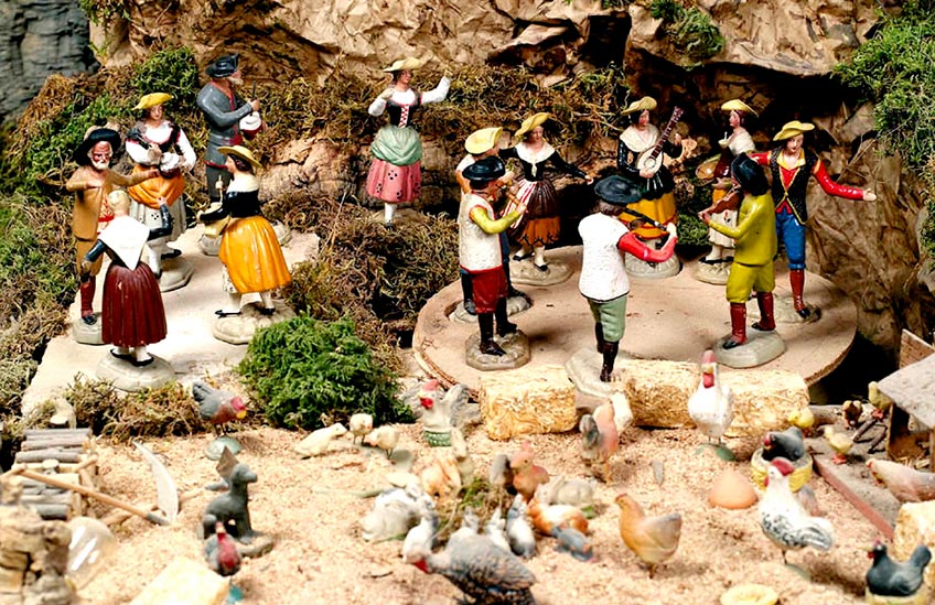 Particular interés poseen los grupos de danzantes y músicos que, por las calles y plazas de la estructura tridimensional del belén, alegraban el ambiente hasta límites insospechados, ya que ancianos, jorobados y lisiados se contagian y bailan al son de panderos, zambombas, sonajas e incluso instrumentos de viento y cuerda. La exaltación del gaudium, que invadía las casas y las celebraciones litúrgicas de aquellos días, se reflejaban en el belén popular, no sólo en danzantes y músicos, sino en gestos de pastores y rústicos, tanto en el mercado y en los trabajos ordinarios, como en alborozadas labradoras montadas en burros, con sus correspondientes presentes, que van cantando y tañendo instrumentos pastoriles. Abundan los viandantes, oferentes, hombres trabajando sus huertas, o almorzando en mesones los típicos huevos fritos o guisando las migas en enormes sartenes.