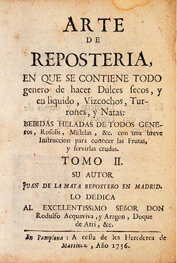 Portada del libro Arte de repostería de Juan de la Mata, editado en Pamplona en 1756. Colección particular