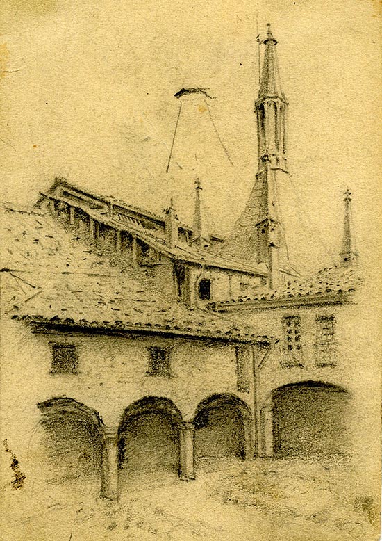 Dibujo a lápiz del arcedianato de la catedral de Pamplona, comienzos del siglo XX. Colección Particular