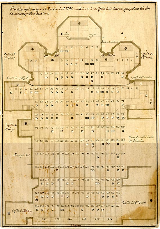 Planta de la parroquia de San Saturnino de Pamplona con el encajonado numerado para identificar las sepulturas con un número correspondiente a las familias o personas y señalamiento de las mismas con una D o dos DD (dotadas y doblemente dotadas). 1796