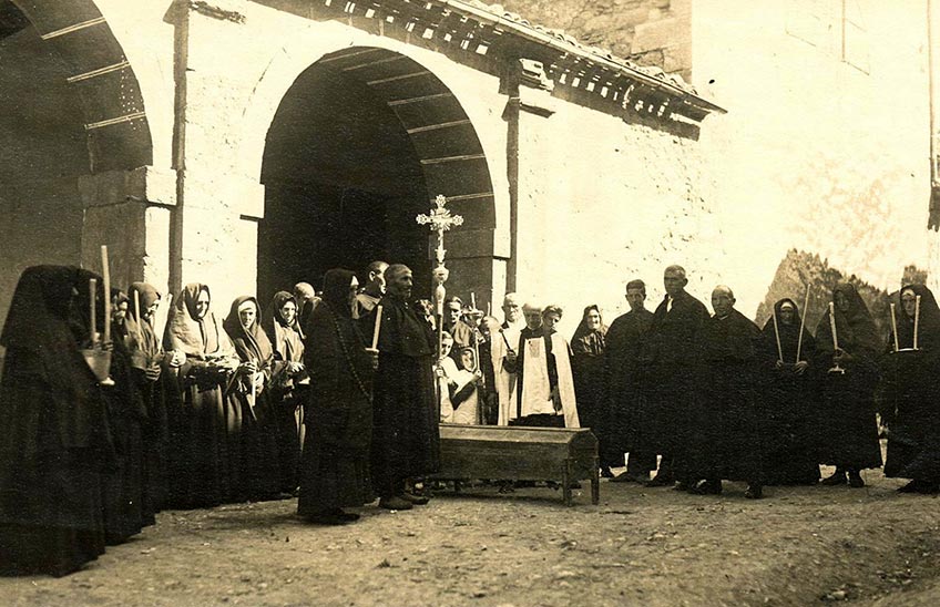 Responso por los difuntos en el atrio de la parroquia de Villanueva de Araquil. Foto de José Roldán publicada en La Avalancha 7 de noviembre de 1931. Fototeca del Archivo Municipal de Pamplona