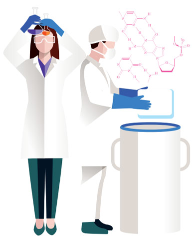 Investigación a nivel molecular en centros públicos y privados en campos como la bioquímica, genética, biotecnología, microbiología, toxicología, farmacología o análisis forenses.