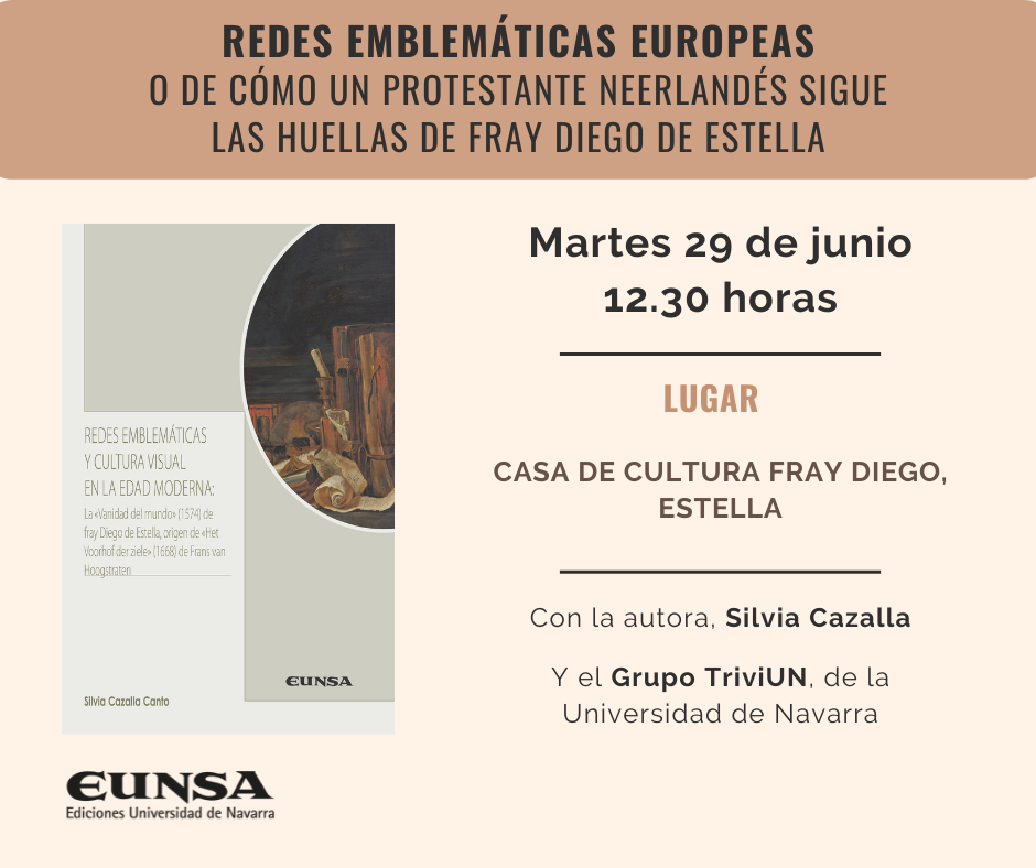 – Redes emblemáticas europeas o de cómo un protestante neerlandés sigue las huellas de Fray Diego de Estella. 29 de junio de 2021 a las 12:30 h. en la Casa de Cultura Fray Diego. Estella. Presentación de libro con su autora, Silvia Cazalla. Cartel.
