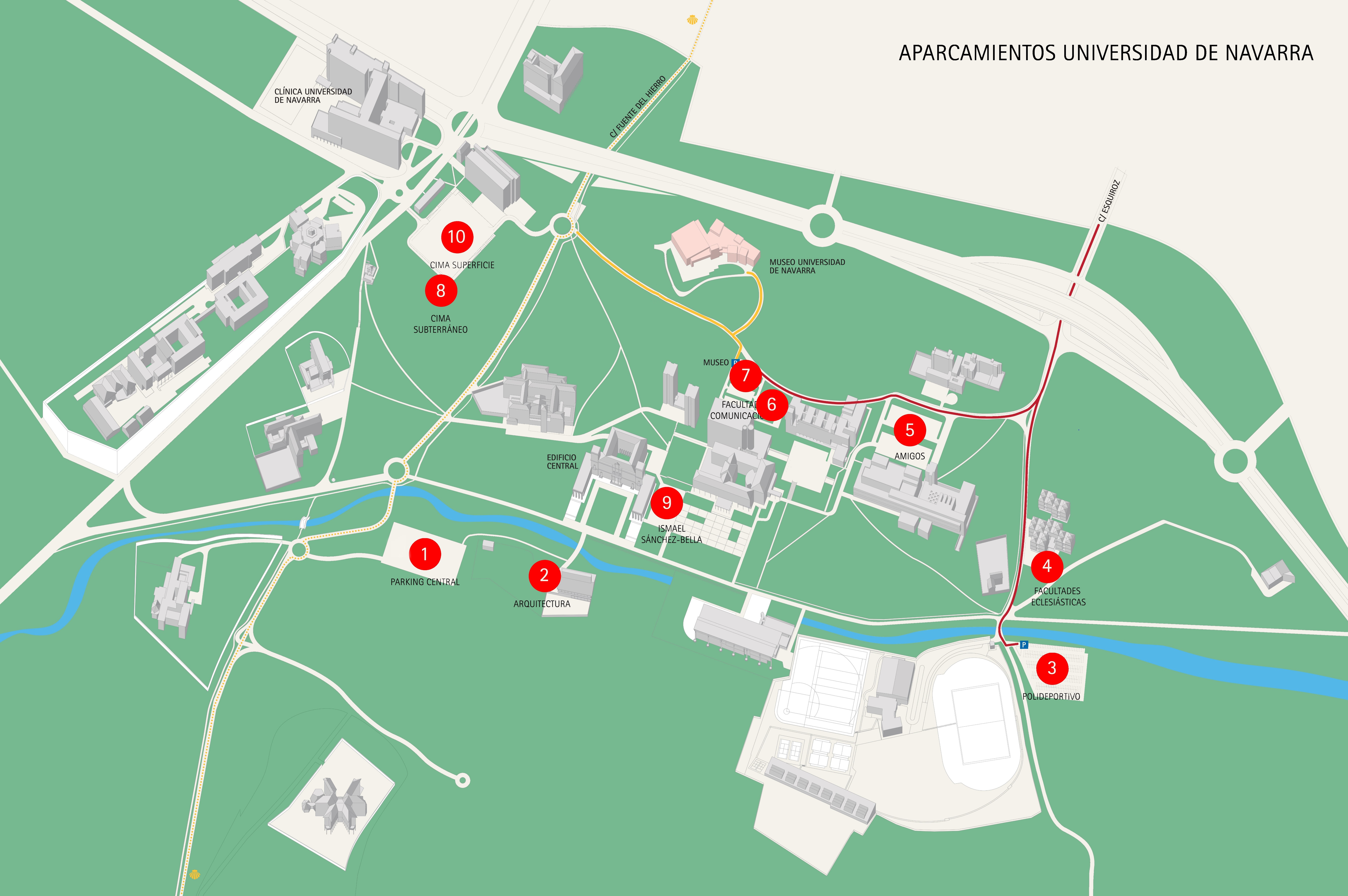 En el Campus de la Universidad de Navarra existen diferentes aparcamientos con diferentes usuarios. Algunos de ellos son exclusivamente para empleados, otros son para empleados y alumnos, y alguno para visitas y usuarios del polideportivo.