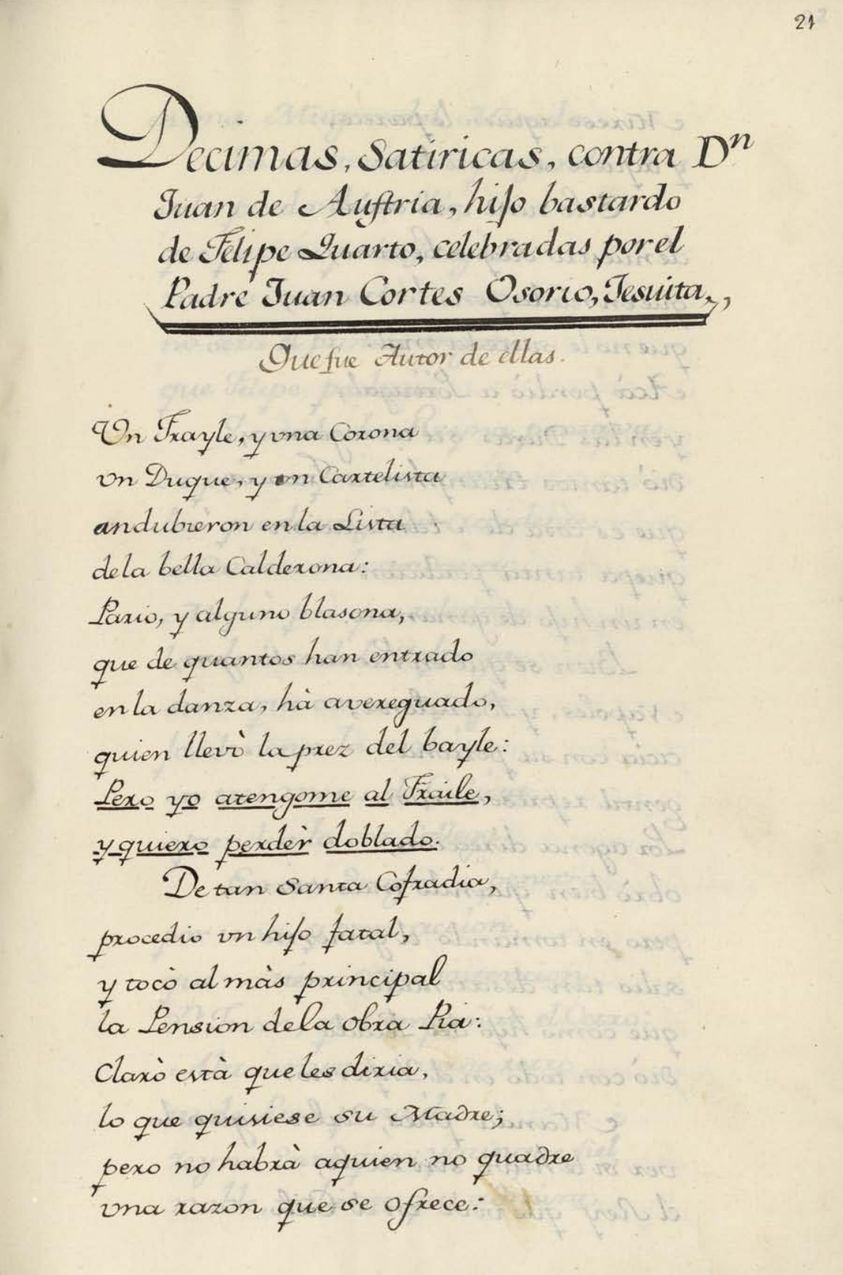 Imagen de "Artículos, capítulos de libro y otras publicaciones": «Décimas satíricas contra don Juan de Austria, hijo bastardo de Felipe Cuarto, celebradas por el padre Juan Cortés Osorio, jesuita», en Papeles en prosa y verso relativos al reinado de Carlos II, Ms. 18216 de la BNE, fol. 21.
