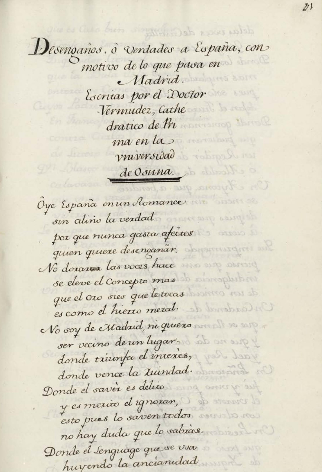 Imagen 1 de "Actualidad": «Desengaños o verdades a España, con motivo de lo que pasa en Madrid. Escritas por el Dr. Bermúdez, Catedrático de Prima en la Universidad de Osuna», en Papeles en prosa y verso relativos al reinado de Carlos II, Ms. 18216 de la BNE, fol. 41r.