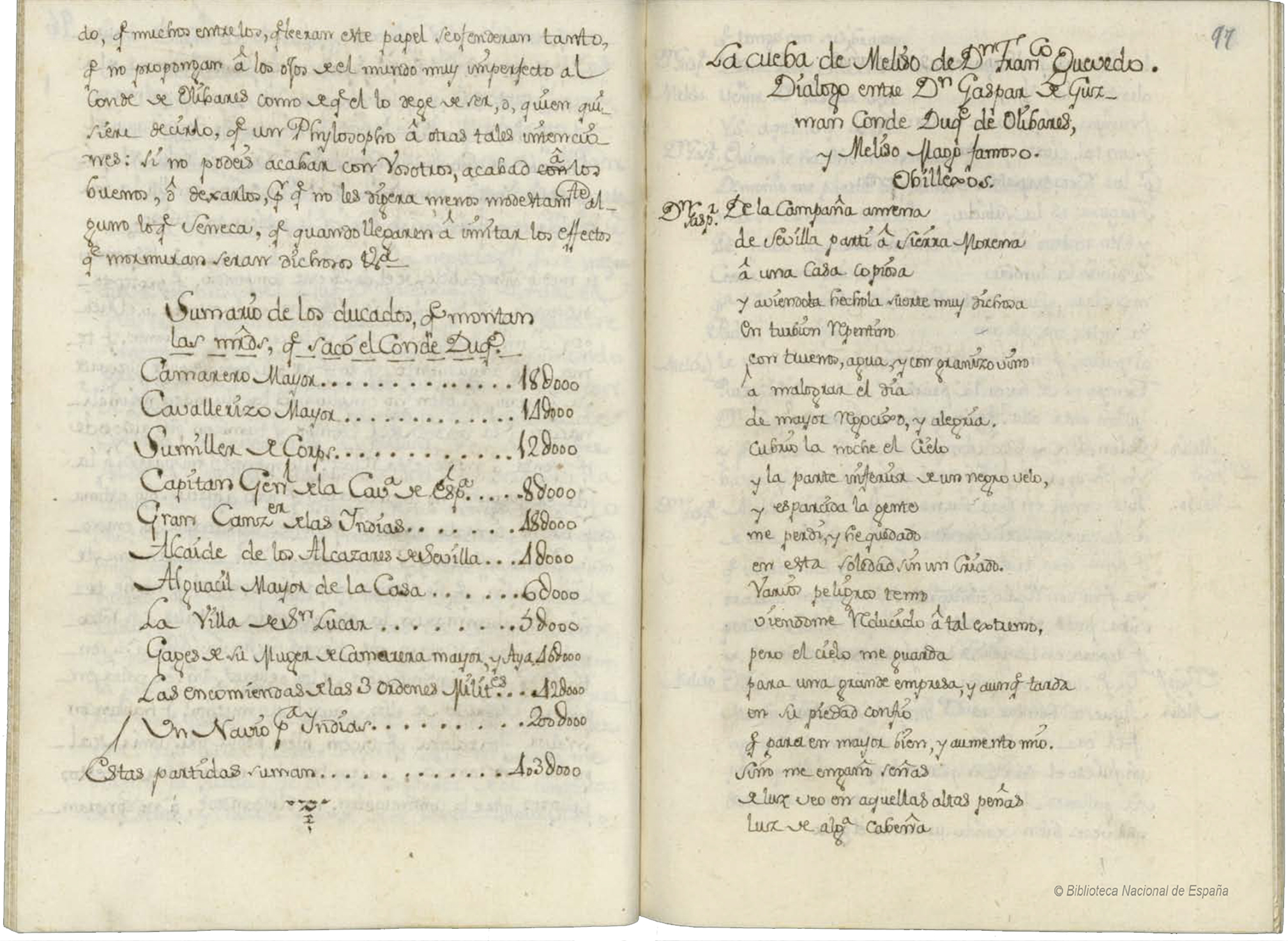 Imagen de "El equipo": «La cueva de Meliso, Diálogo entre don Gaspar de Guzmán, conde Duque de Olivares y Meliso, mago famoso», en Papeles referentes al Conde Duque de Olivares, Ms. 2311 de la BNE, fol. 97r
