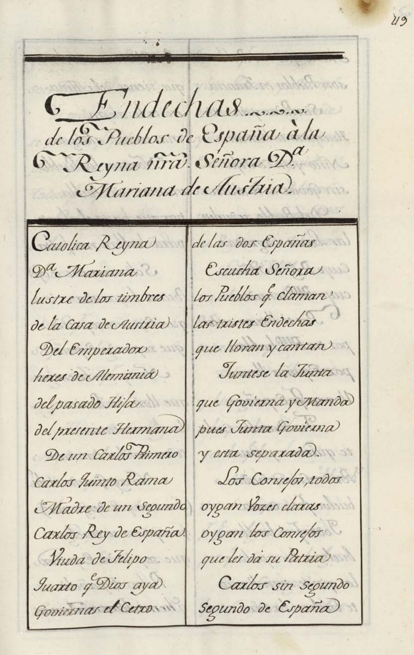 Imagen 2 de "Actualidad": «Endechas de los pueblos de España a la reina nuestra señora doña Mariana de Austria», en Papeles en prosa y verso relativos al reinado de Carlos II, Ms. 18216 de la BNE, fol. 49r.