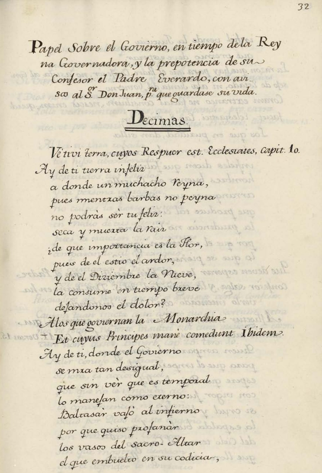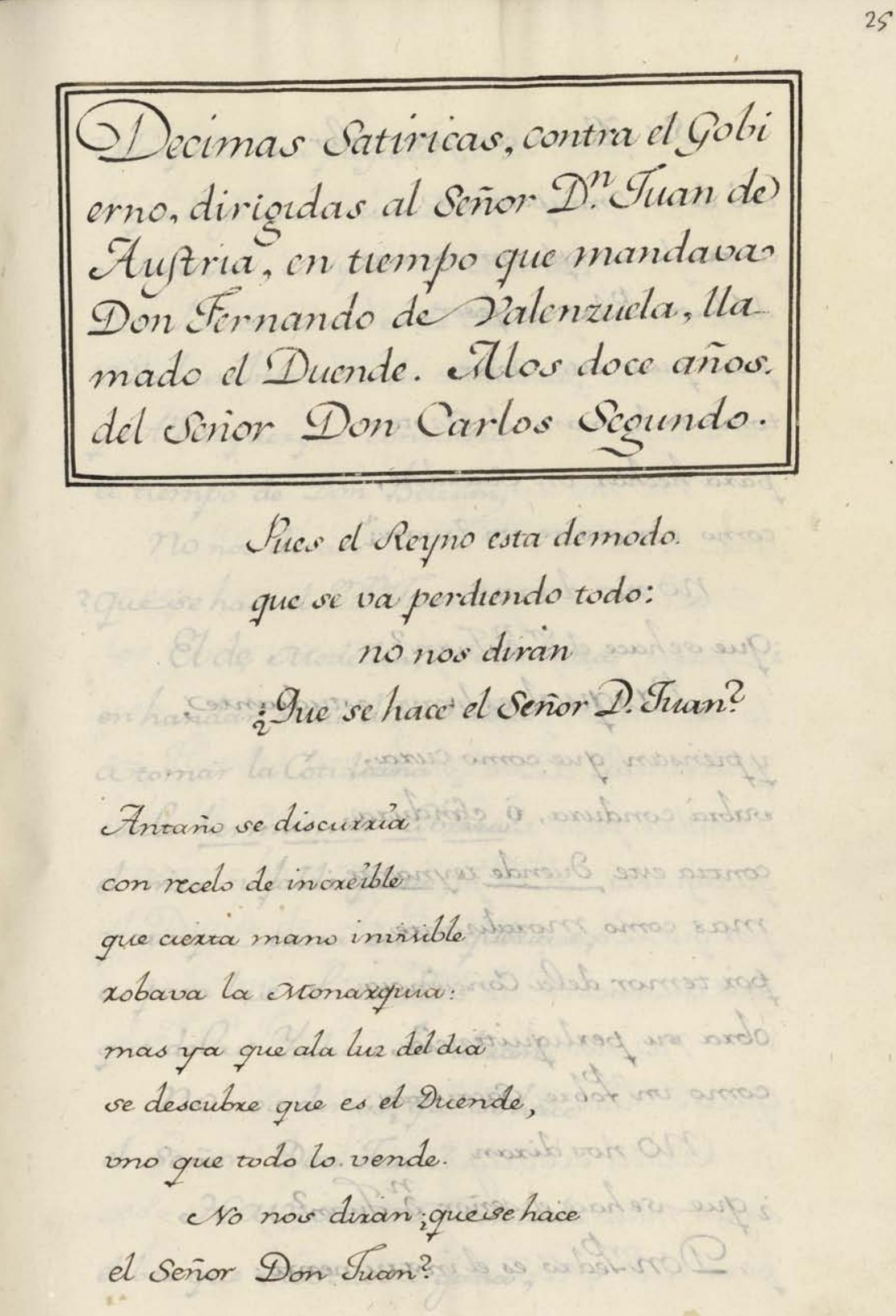 Imagen 4 de "Actualidad": «Décimas satíricas, contra el gobierno, dirigidas al señor don Juan de Austria, en tiempo que mandaba don Fernando de Valenzuela, llamado el Duende. A los doce años del señor don Carlos Segundo», en Papeles en prosa y verso relativos al reinado de Carlos II, Ms. 18216 de la BNE, fol. 25r.
