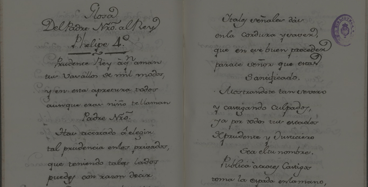Imagen de la cabecera: «Glosa del Padre Nuestro Rey Felipe IV», en Obras poéticas del Conde de Villamediana, Ms. 10573 de la BNE, fol. 51v-52r.