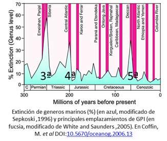 La última gran extinción (la 5ª), producida hace 65 millones de años coincidiendo con el famoso límite cretácico-terciario, produjo la desaparición del 75% de las especies del planeta, entre ellas los dinosaurios. La hipótesis más aceptada actualmente establece que esta extinción se produjo por el cambio en el clima producido por el impacto de un meteorito de grandes dimensiones en la zona de México. Sin embargo, coincidiendo con ese momento se produjo el emplazamiento de los basaltos del Deccan en la India, lo que ha llevado a parte de la comunidad científica a postular que pudo ser el efecto combinado de ambos eventos catastróficos, el que causó la desaparición de los dinosaurios.