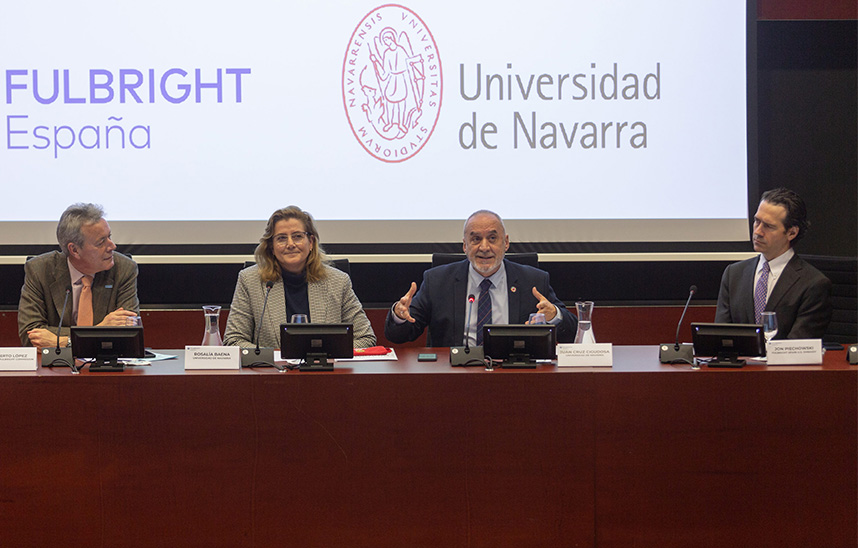 FotoManuel Castells/De izquierda a derecha, Alberto López, director ejecutivo de la Comisión Fulbright; Rosalía Baena, vicerrectora de Estudiantes de la Universidad de Navarra; Juan Cruz Cigudosa, consejero de Universidad, Innovación y Transformación Digital del Gobierno de Navarra; y Jon Piechowski, consejero para Diplomacia Pública de la Embajada de Estados Unidos.