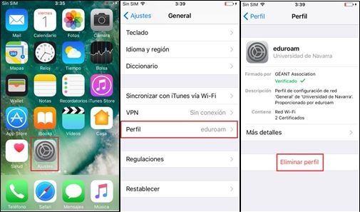 1. Ve a Ajustes/General/Perfil y elimina el perfil eduroam.