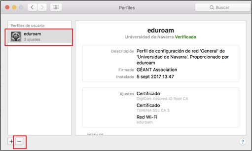 2. Pulsa en Eduroam y haz clic en el signo ”-” para eliminarla.