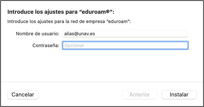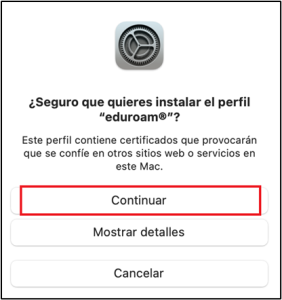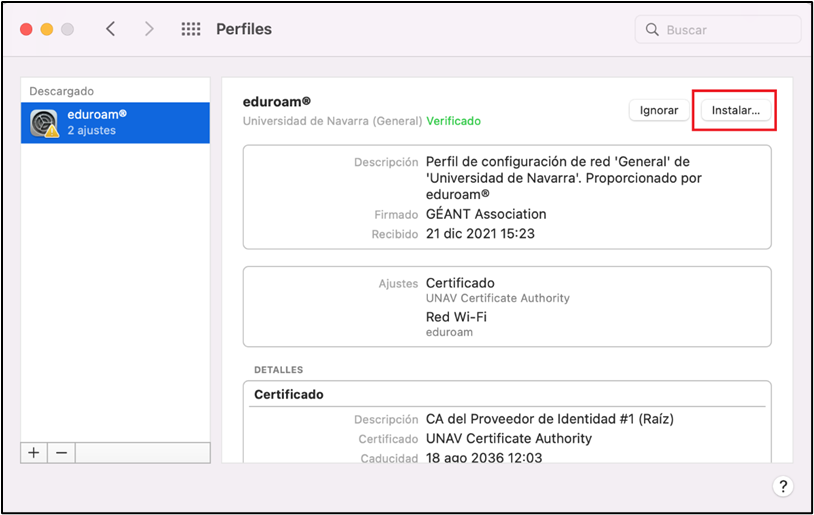 - Seleccionamos Eduroam y pulsamos en Instalar y Continuar