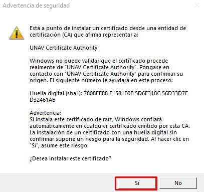 - Pulsamos el botón "Sí" para terminar la instalación del certificado.