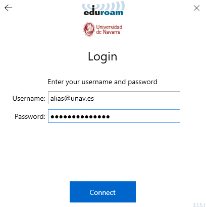 - Introduce tu usuario (cuenta completa de la Universidad) y tu contraseña, y pulsa sobre el botón "Connect"