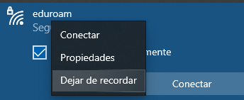 - Pulsa con el botón derecho sobre "Eduroam" y selecciona "Dejar de recordar"