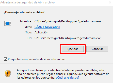 - Instala la aplicación geteduroam descargada haciendo doble click.