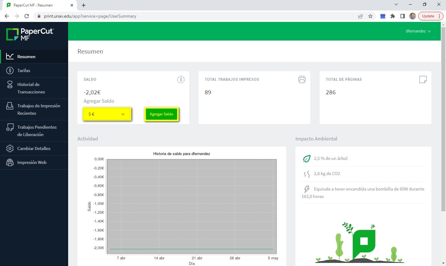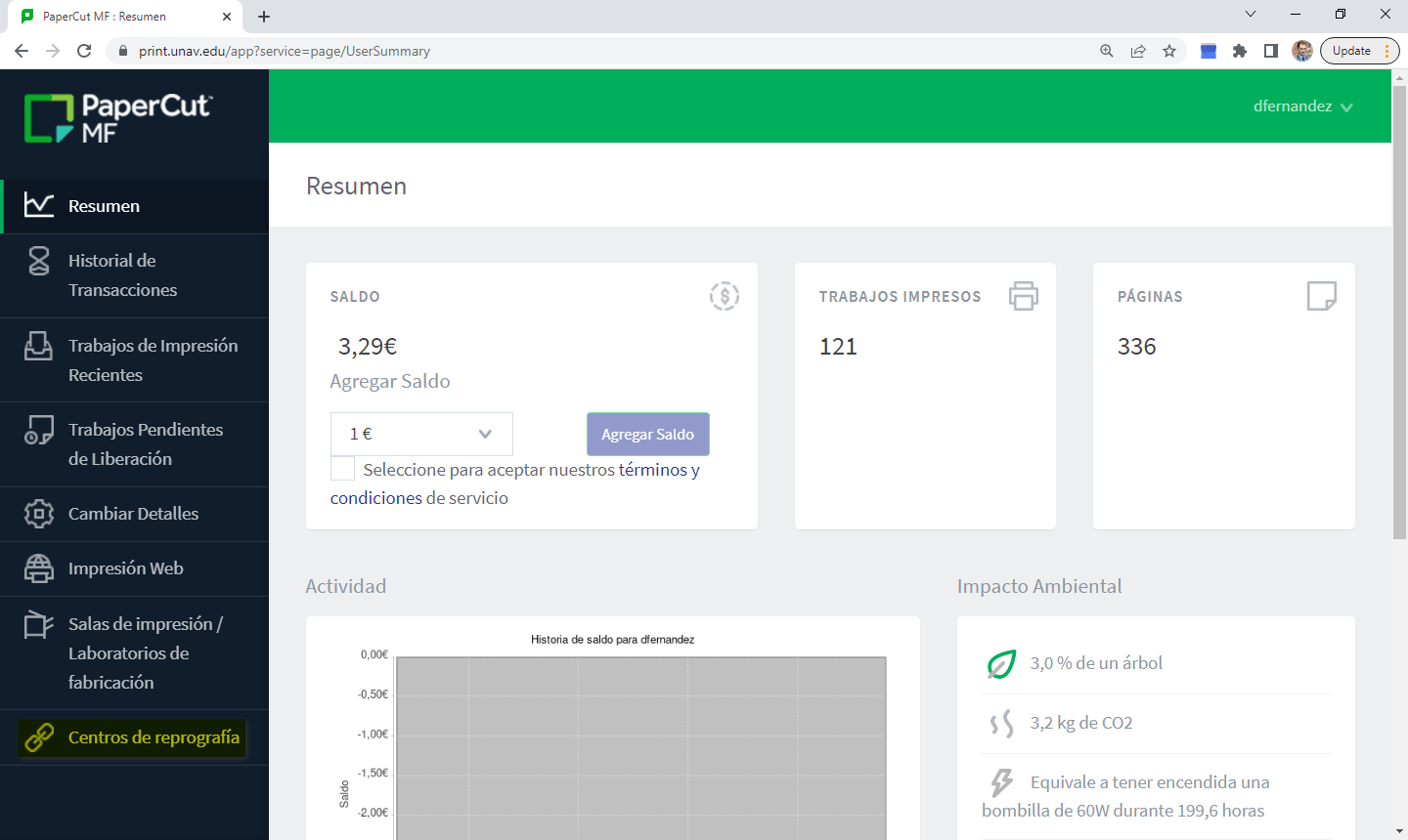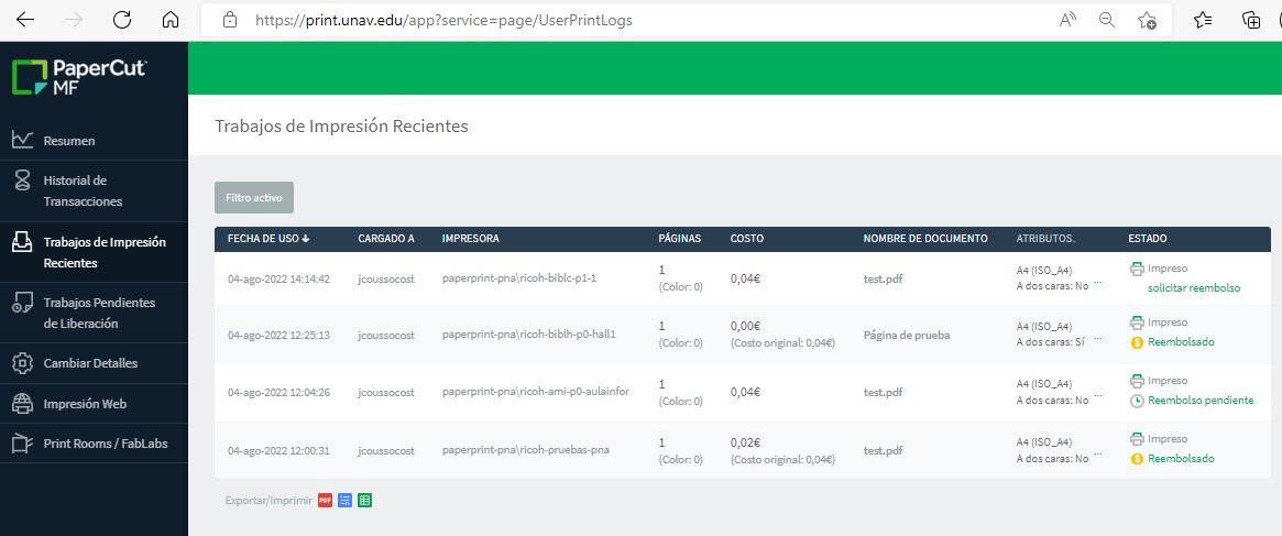 Además de usar la pasarela de pago, los empleados de la Universidad podrán solicitar cargas de saldo en los centros de reprografia, indicando la dirección de correo electrónico, el centro de coste y el saldo a cargar en la cuenta de papercut.