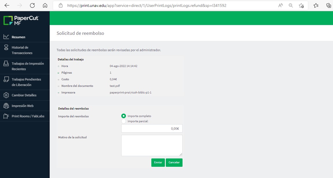 Cuando por daños en el papel o material de impresión, el trabajo impreso resulte inservible, puedes solicitar la devolución del importe cargado siguiendo estas instrucciones: