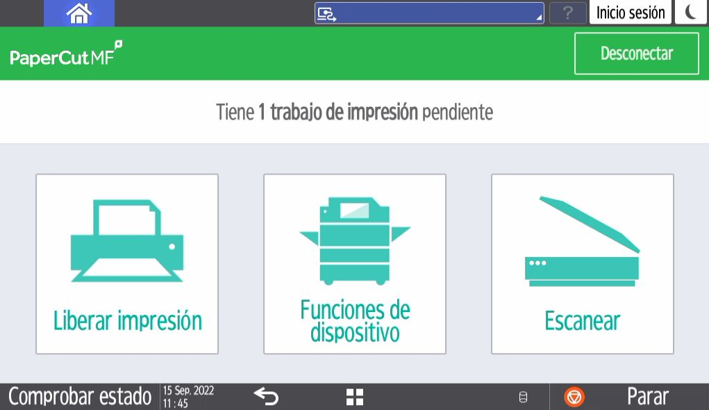 El menú principal del equipo tiene 3 apartados: Liberar impresión, Funciones del dispositivo y Escanear.