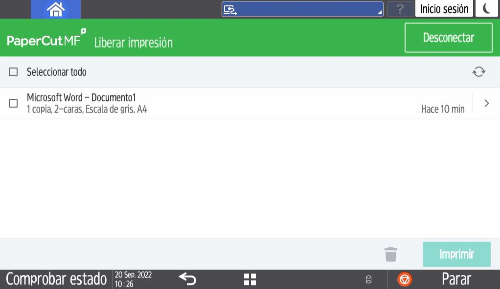 Seleccionando “Liberar impresión”, puedes ver tus tareas enviadas a la cola de impresión. A continuación has de seleccionar aquellas que desees liberar, desmarcar la casilla "Impriier en negro" si deseas que tu tarea se imprima en color, y pulsar la tecla “Imprimir”.