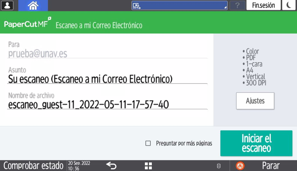 Para enviar a documentos a tu buzón de correo, introduce el documento a escanear en el alimentador con el texto hacia arriba, selecciona los ajustes deseados y pulsa la tecla “Iniciar el escaneo”.