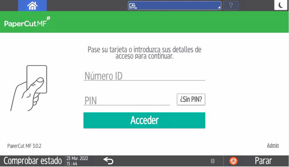 Una vez activado el PIN, ya puedes autenticarte en cualquiera de los equipos multifunción de autoservicio, usando la tarjeta universitaria y el pin generado.