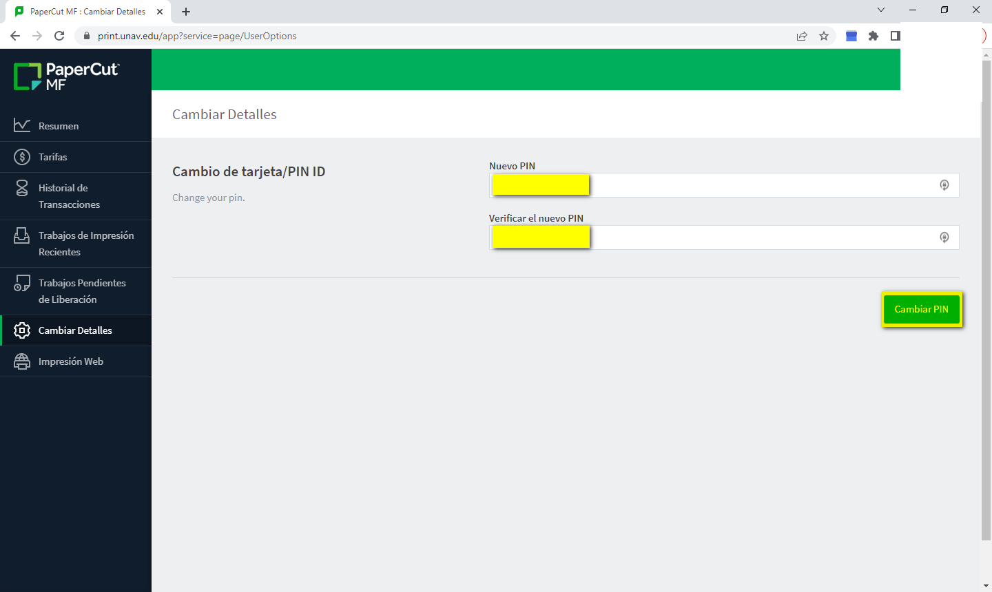 3. Introduce tu nuevo pin y haz clic sobre "Cambiar PIN"