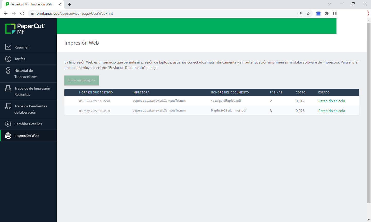 1. Desde el Portal de impresión print.unav.edu accede a "Trabajos de Impresión Recientes" para revisar las últimas tareas enviadas.