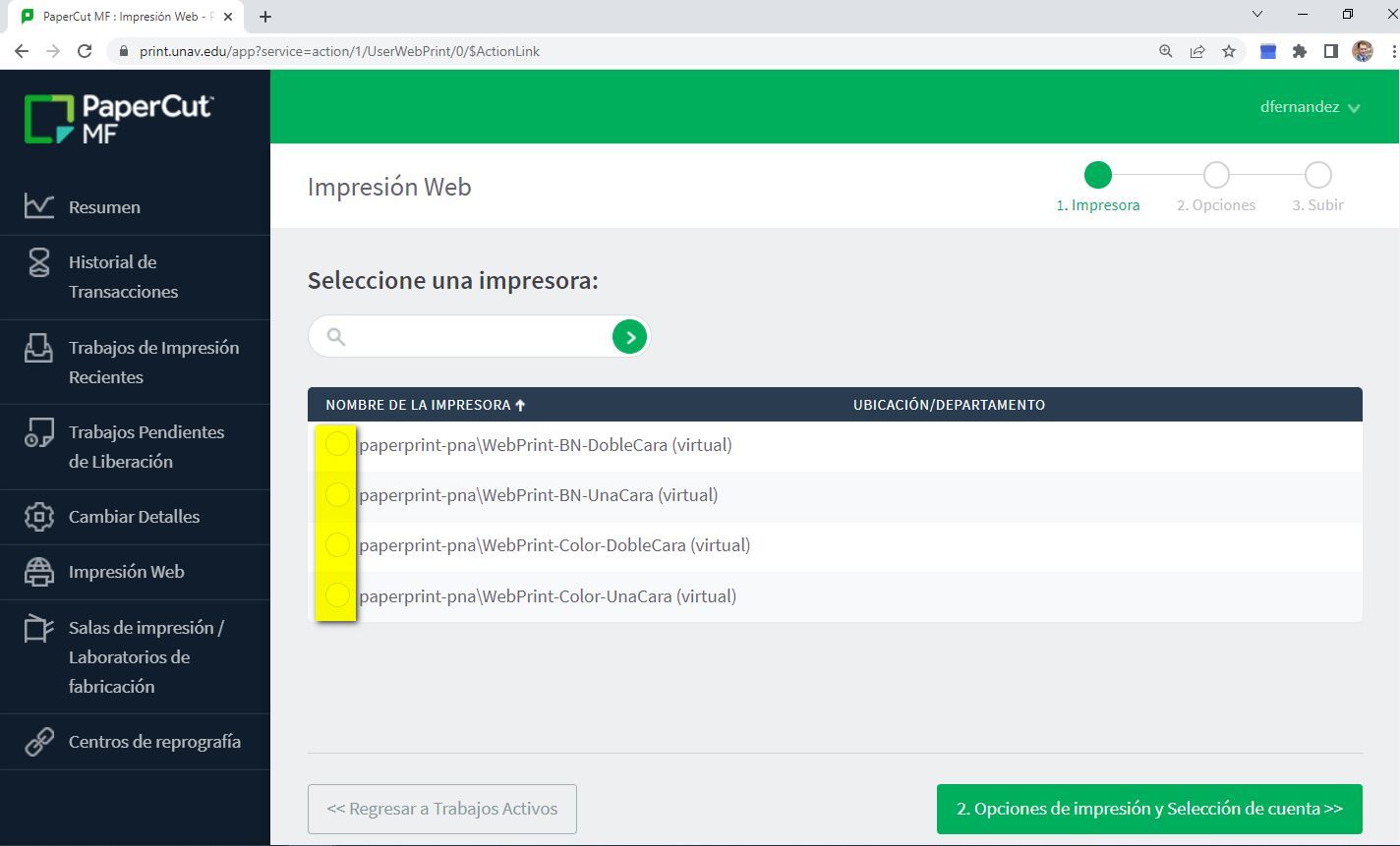 3. Selecciona la cola de impresión (BN o Color y a Una o Doble cara), y haz clic sobre " Opciones de impresión y Selección de cuenta"