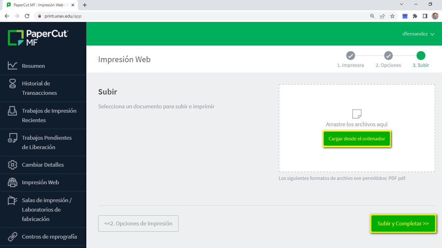 Si no tienes a mano un dispositivo con la impresora de autoservicio instalada, puedes imprimir archivos PDF desde el Portal del sistema de impresión