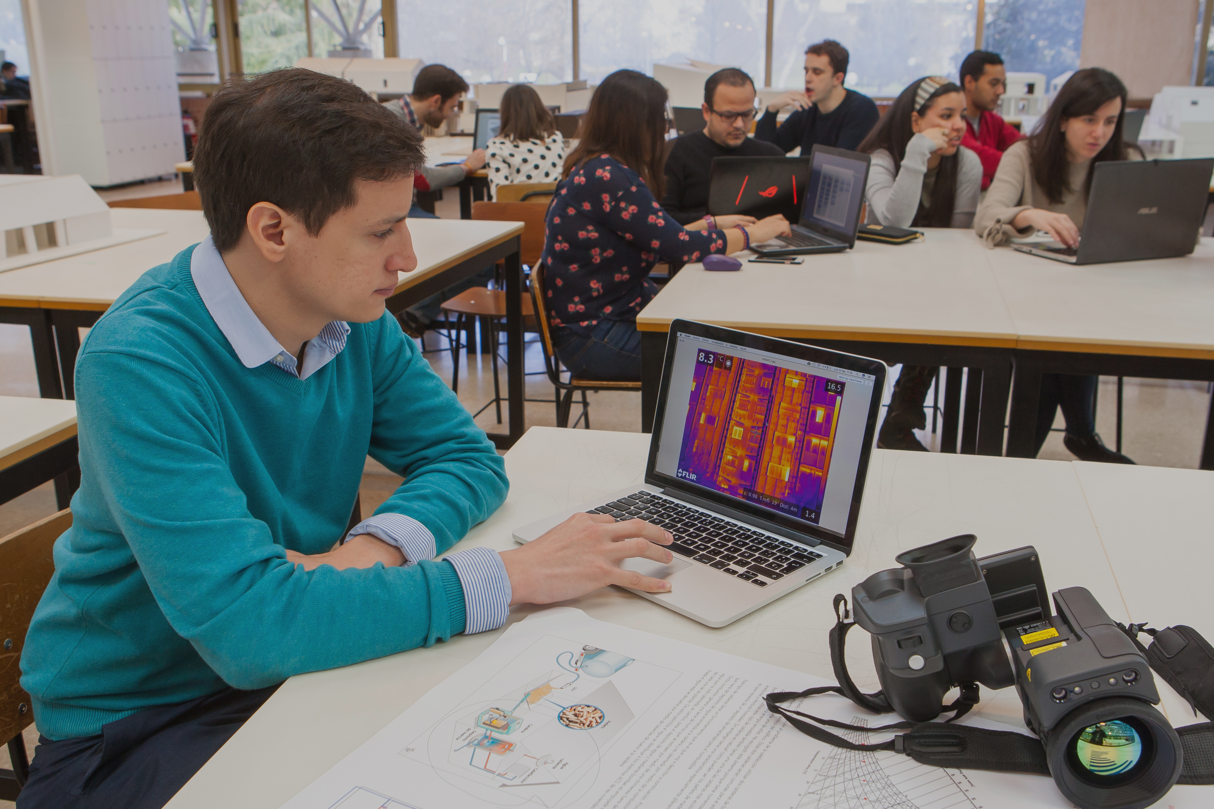 Los alumnos del Máster en Diseño y Gestión Ambiental de Edificios aprenden a cuantificar la eficiencia de las medidas ambientales adoptadas con objeto de disminuir el impacto de la edificación en el medio ambiente. Manejan programas de simulación (Design Builder, estándar Passive House, SimaPro...) y equipos de monitorización para verificar el comportamiento real de los edificios (sensores, datalogger, termoflujómetro, blower door, cámaras termográficas).
