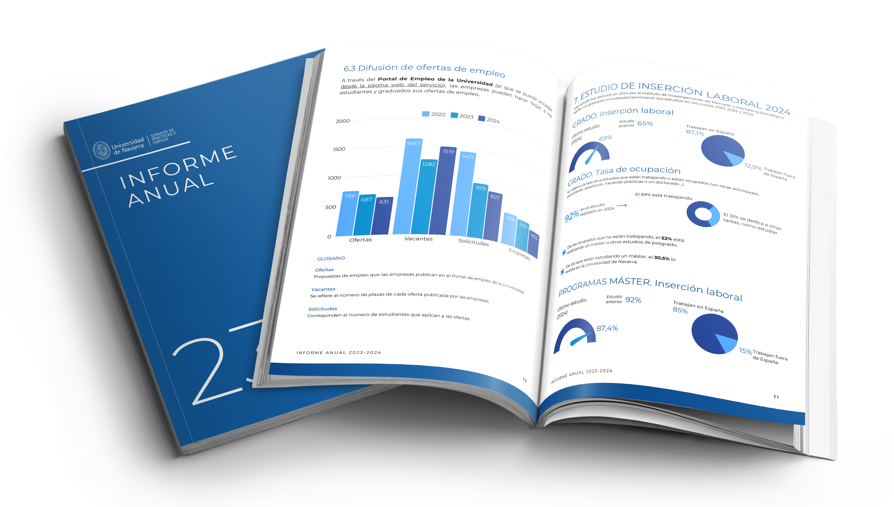 En esta página se publica el informe anual de prácticas y empleo. Un informe que recoge todas las iniciativas, actividades y datos registrados a lo largo del curso pasado, relacionados con el desarrollo profesional de estudiantes de la Universidad: prácticas, formación, asesoramiento, eventos, datos de inserción laboral, etc.