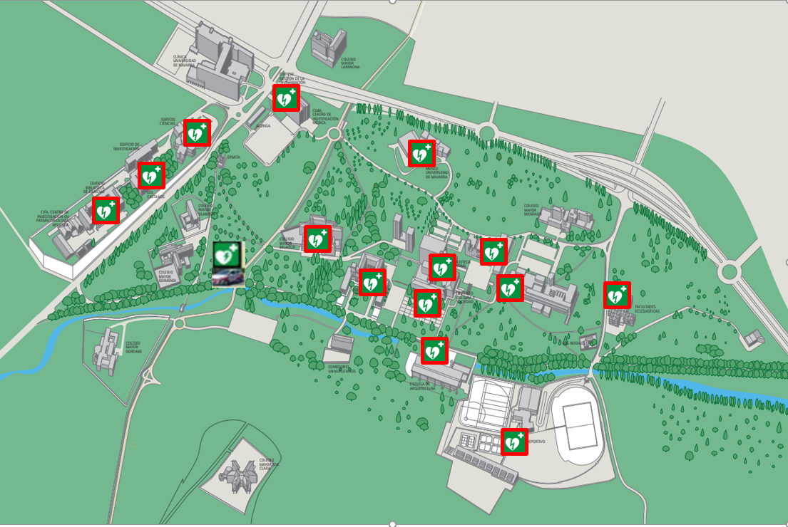 En los Campus de la Universidad de Navarra se dispone de desfibriladores semiautomáticos, y personas formadas en su utilización, para asistir a una persona en los primeros minutos tras una parada cardíaca.