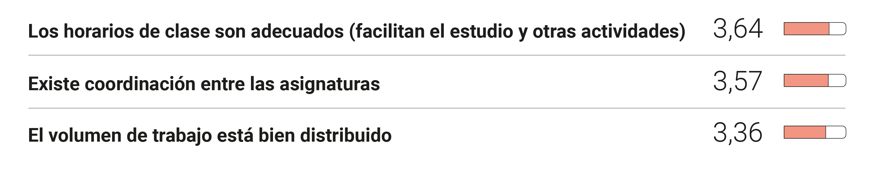 Respecto a las marcas más negativas, la encuesta indica: la distribución del volumen de trabajo (3,36 sobre 5), coordinación de las asignaturas (3,57 sobre 5) y horarios adecuados (3,64 sobre 5); todos ellos valores que corresponden con la variable Organización de la Docencia. Por otro lado, este curso destaca el servicio de Deportes con una marca negativa (3,34 sobre 5).