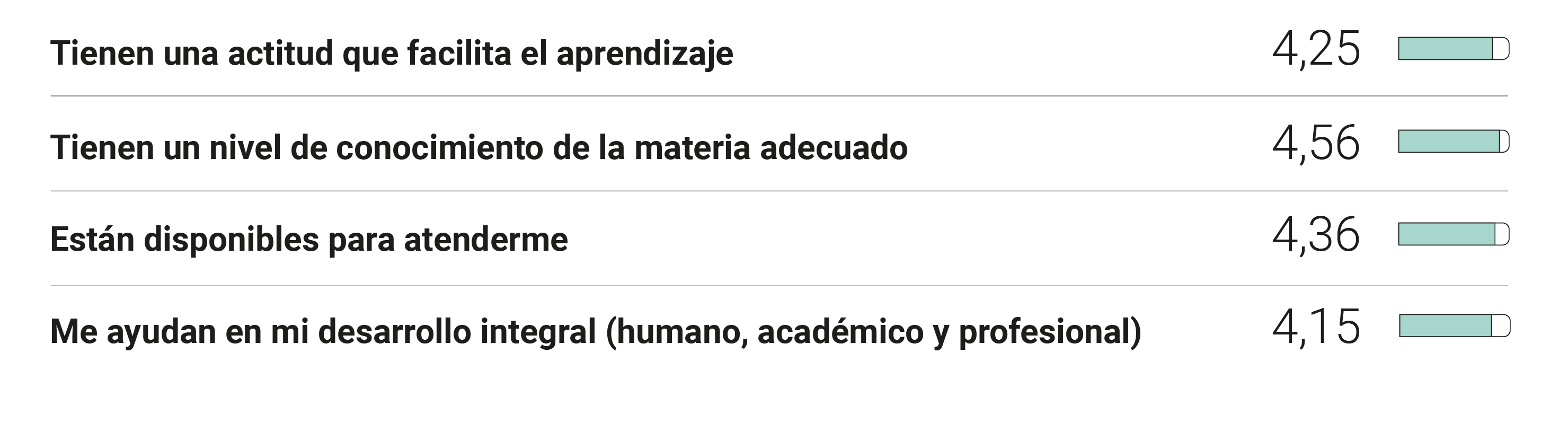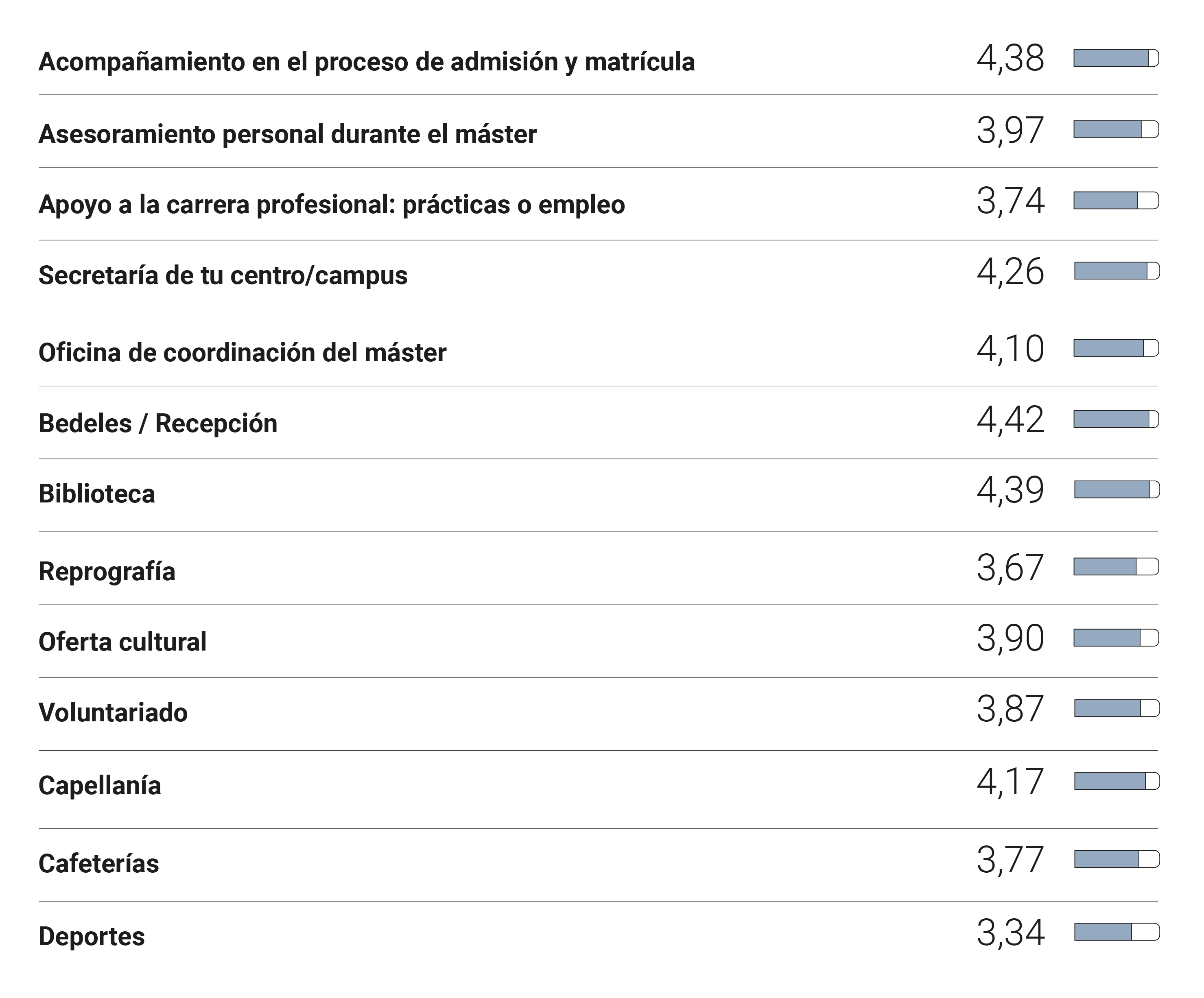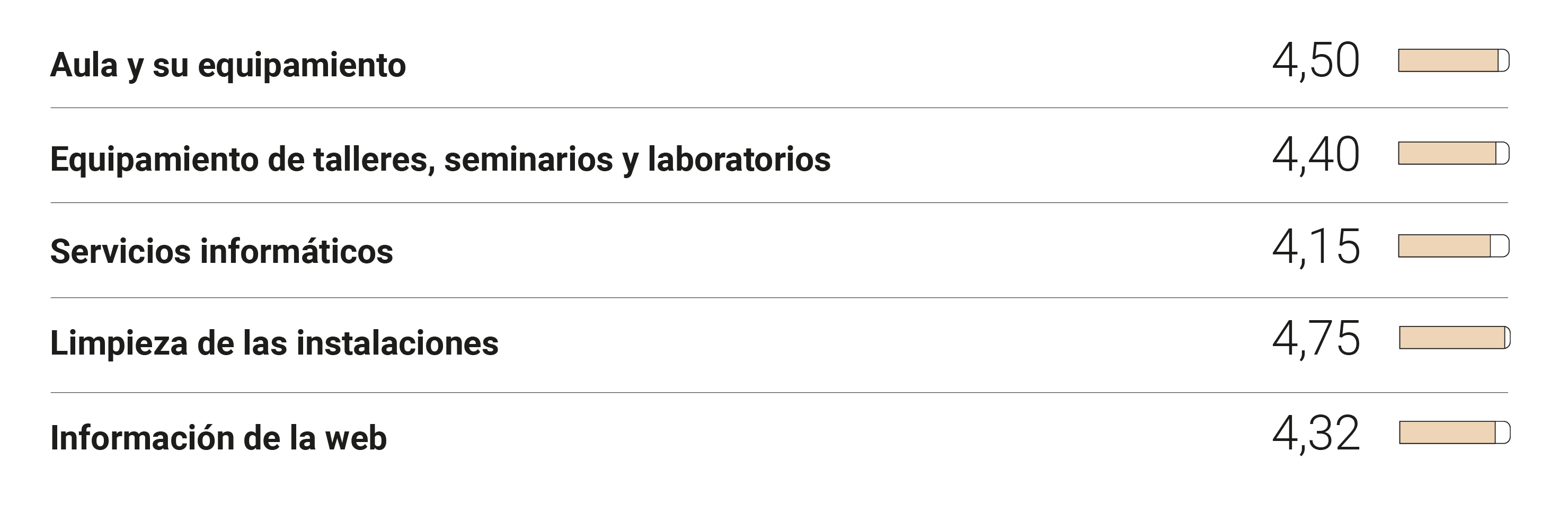 Entre las puntuaciones más positivas, la encuesta destaca: la limpieza de las instalaciones (4,75 sobre 5), el conocimiento de los profesores (4,56 sobre 5), y aulas y su equipamiento (4,50 sobre 5).