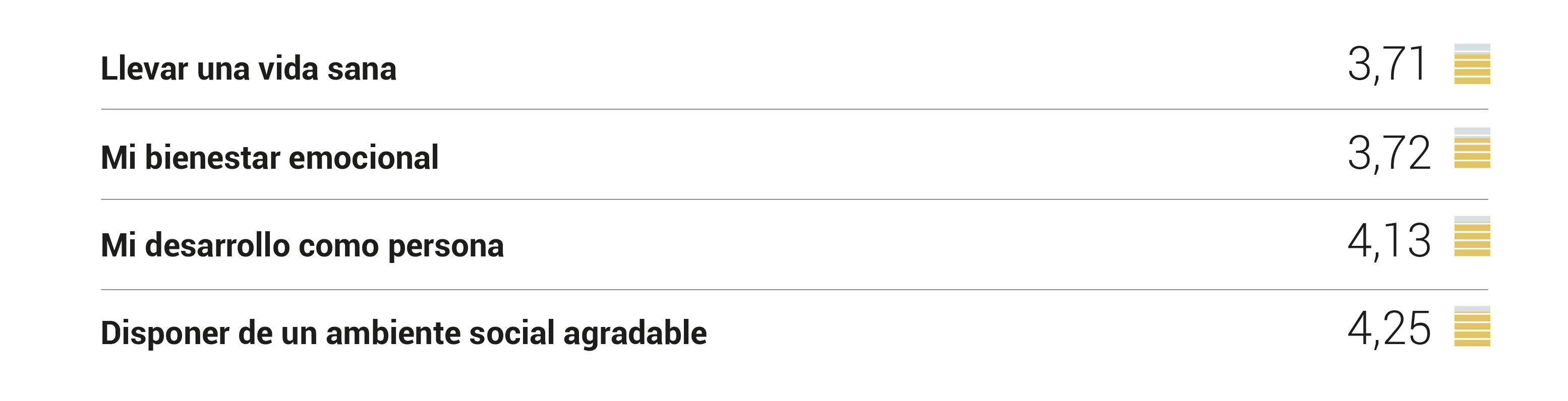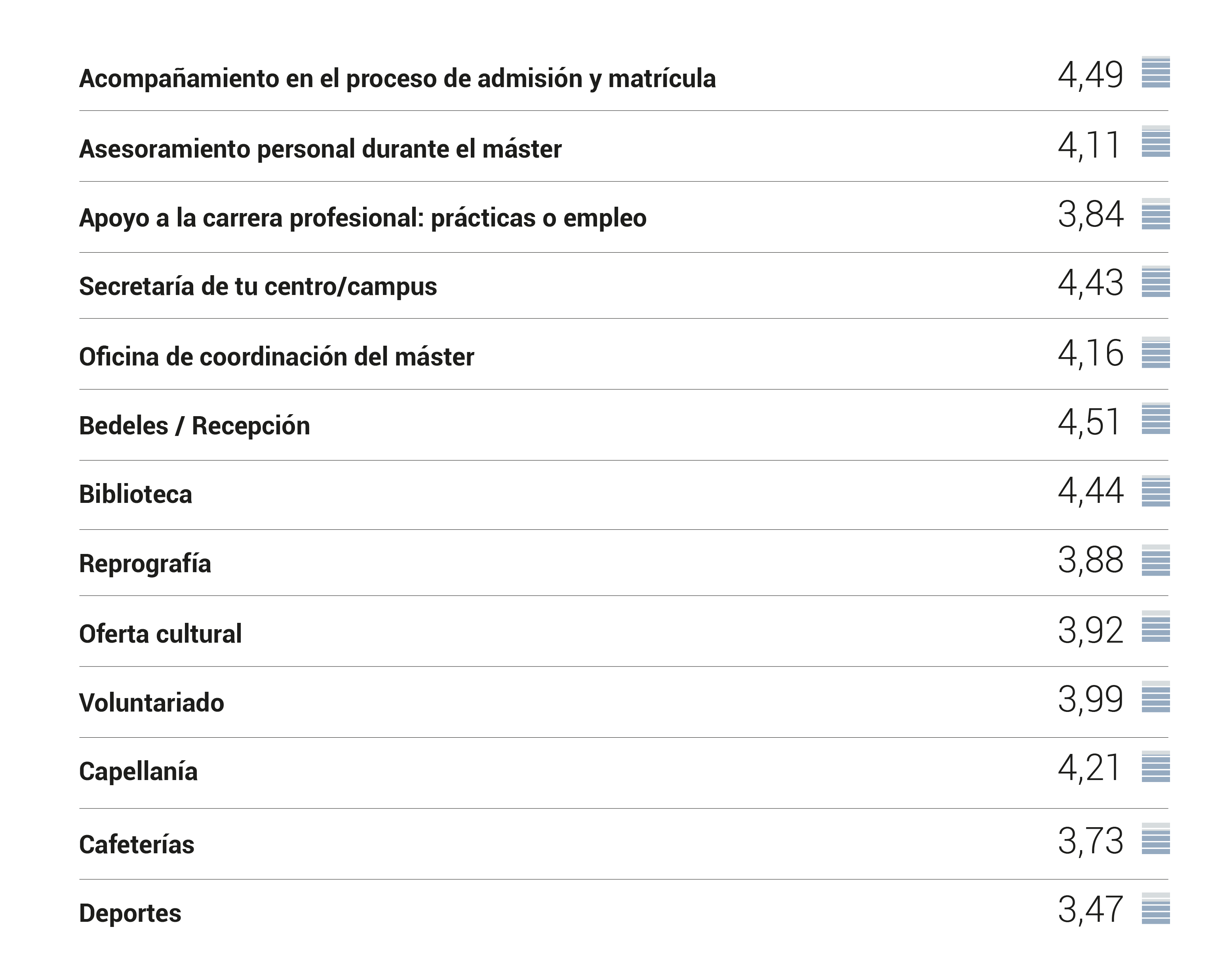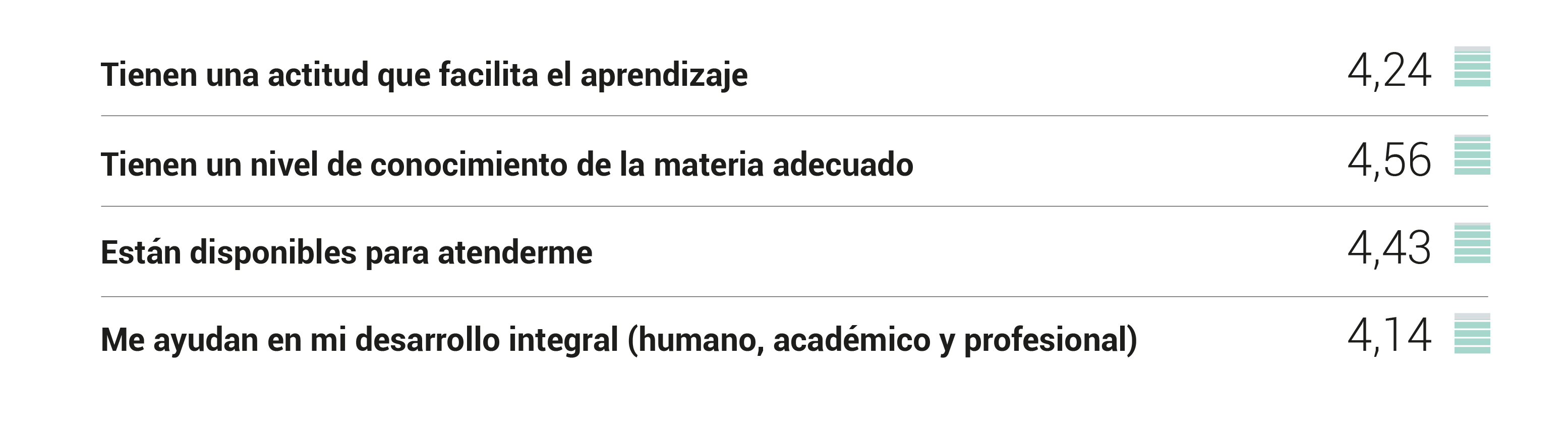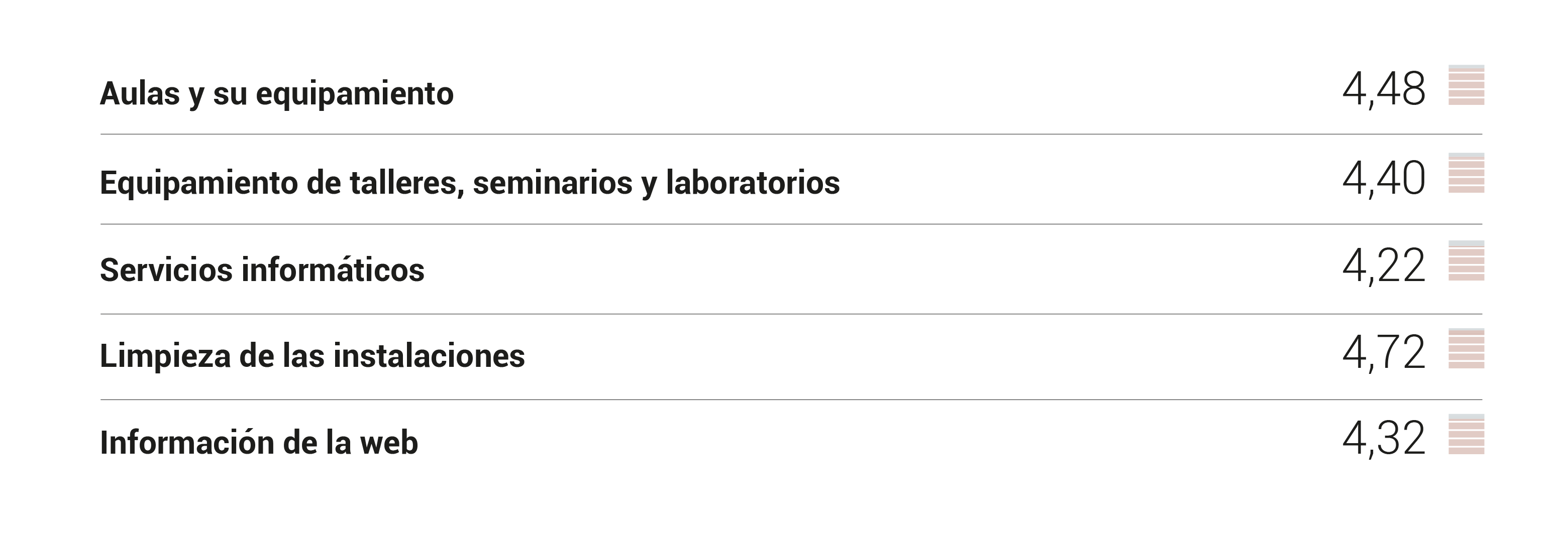 Profesorado Entre las puntuaciones más positivas, la encuesta destaca: la limpieza de las instalaciones (4,72 sobre 5), el conocimiento de los profesores (4,56 sobre 5), y bedeles y recepción (4,51 sobre 5).