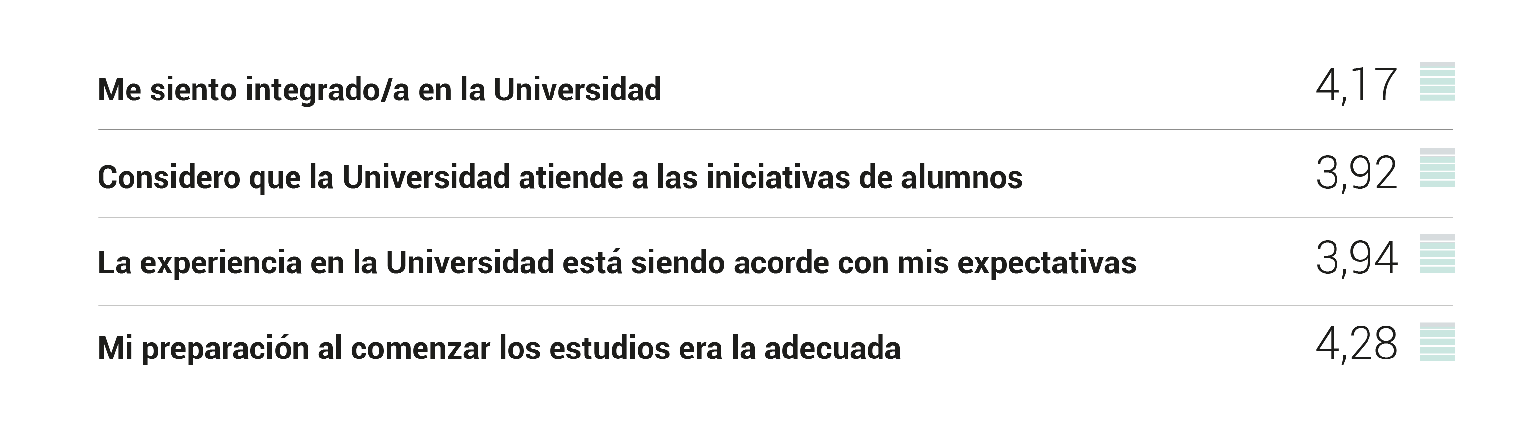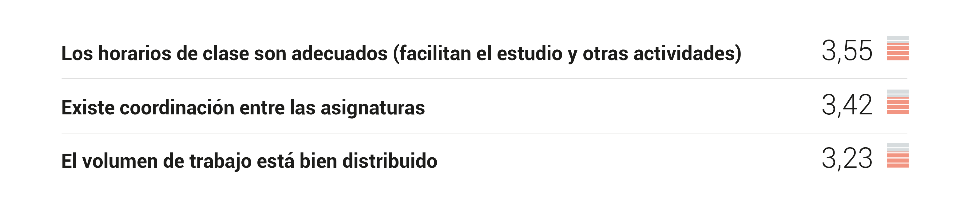 Respecto a las marcas más negativas, la encuesta indica: la distribución del volumen de trabajo (3,23 sobre 5), coordinación de las asignaturas (3,42 sobre 5) y horarios adecuados (3,55 sobre 5); todos ellos valores que corresponden con la variable Organización de la Docencia.